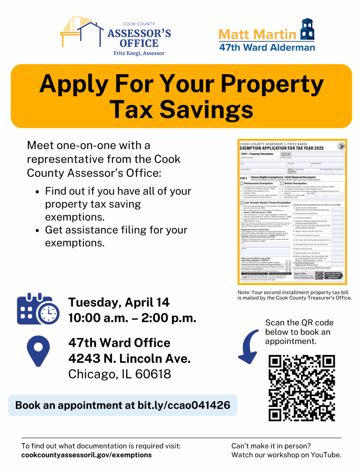 Do you need help applying for property tax exemptions? You can meet one-on-one with a representative from the Cook County Assessor's Office at our office at 4243 N Lincoln Ave.