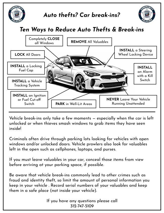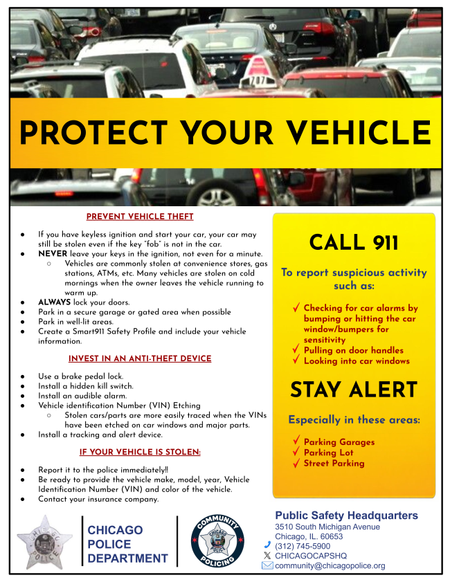 The Third Ward Aldermanic Office issued a special auto safety and security alert, offering vehicle protection tips from the Chicago Police Department. No meetings, policy changes, development approvals, budget decisions, transit updates, or street redesign projects were mentioned. The notice includes the office’s contact details at 5046 South State Street, Chicago, IL 60609.