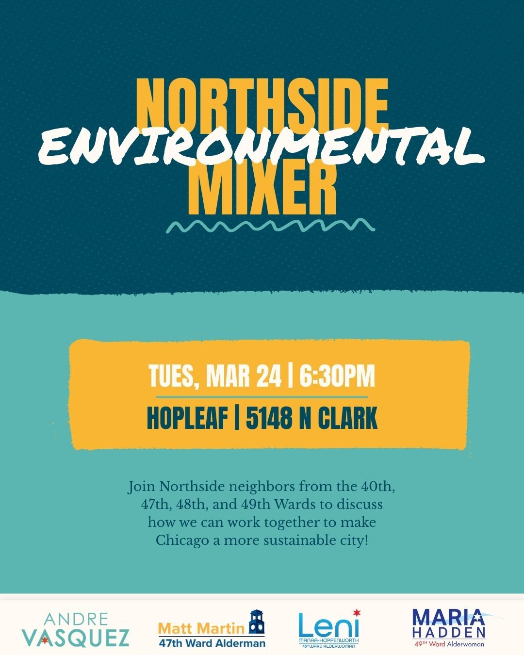 Join Northside neighbors to discuss how we can work together to make Chicago a more sustainable city! Local advocates will be meeting at Hopleaf in Andersonville at 5148 N Clark.