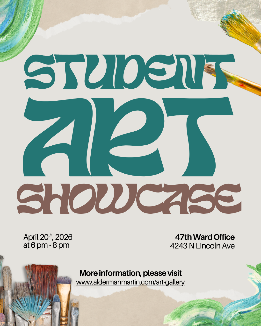 Join us at the 47th Ward Office for a Student Art Showcase at 6 PM featuring work from McPherson 7th graders and Coonley 3rdâ5th graders. Weâre excited to debut these vibrant paintings and collages, which will remain on display in the office for several months following the event.