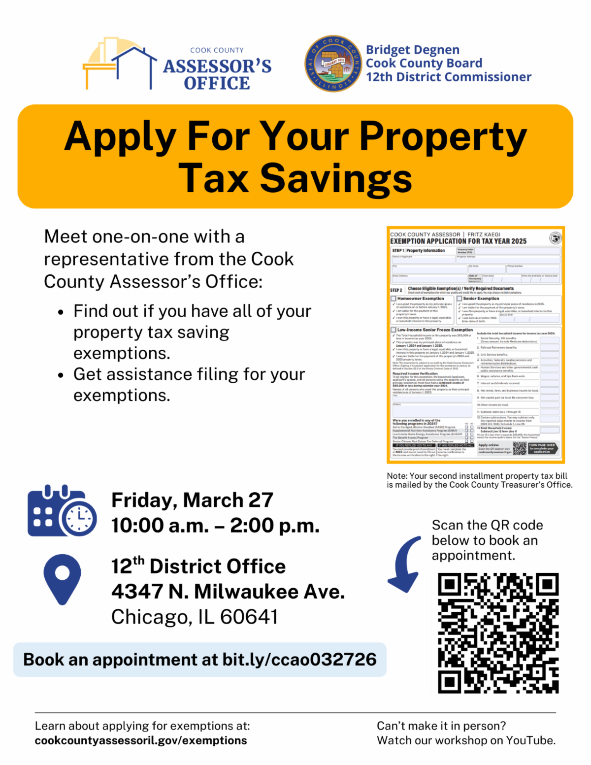 Meet one-on-one with a representative from the Cook County Assessor's Office to find out if you have all of your property tax saving exemptions, and to get assistance filing your exemptions.