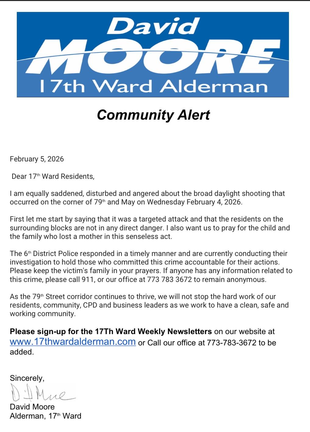 The newsletter from 17th Ward Alderman David Moore contains no specific updates on meetings, policy changes, development approvals, budget decisions, transit service changes, or street safety projects. No additional announcements or events are included.