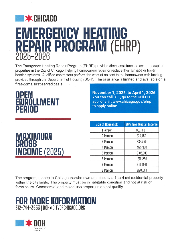 The Department of Housing is launching a pilot program for Green Homes Chicago (GHC) which will offer free home energy upgrades and energy efficiency retrofits for a pool of eligible homeowners who meet certain income requirements. Register on the website www.chicago.gov/greenhomes.