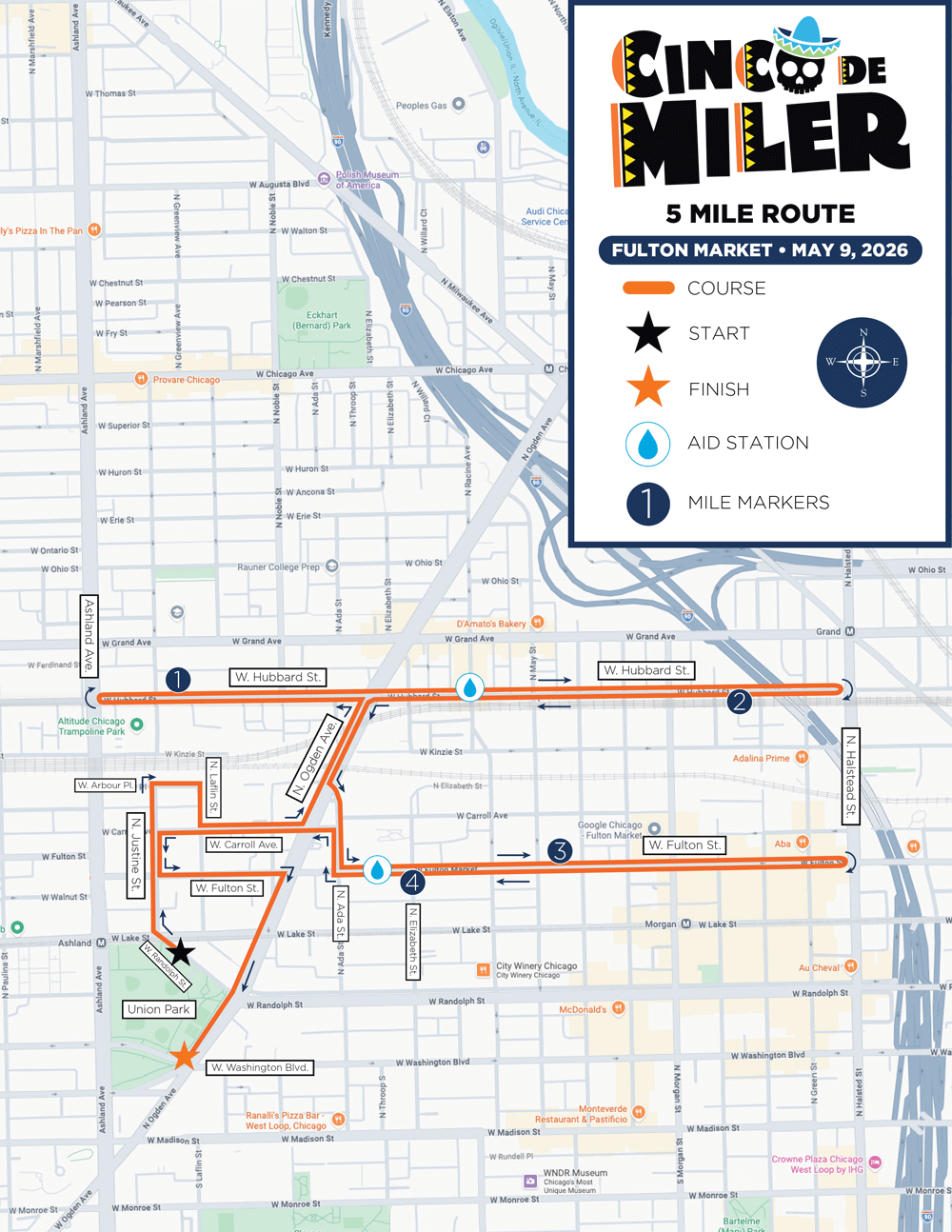 Stepping off at Union Park, runners experience a festive race through the West Loop along Hubbard and Fulton Streets before finishing under a giant 3-story piñata! They'll then celebrate with delicious food, drinks, and live mariachi music at the post-race fiesta.
