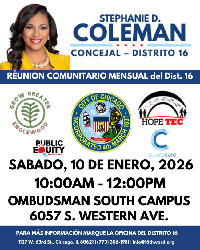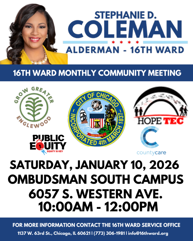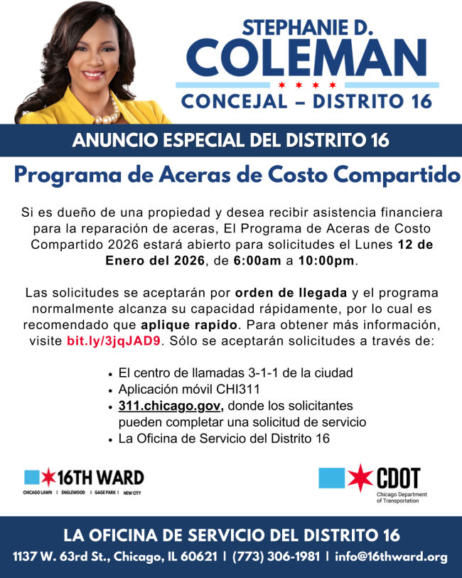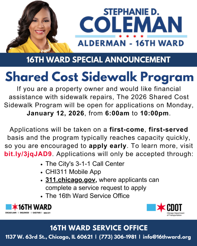 Alderman Stephanie D. Coleman reports no upcoming zoning, development, housing, transit, or budget meetings or policy changes in this edition. Residents are reminded that the property owners’ appeals deadline is February 3, 2026, and the 2026 Shared Cost Sidewalk Program applications open Monday, January 12, 2026. Additional community events include a senior & veteran Valentine’s lunch and a volunteer sign‑up opportunity, with the 16th Ward Service Office open Monday‑Friday during listed hours.