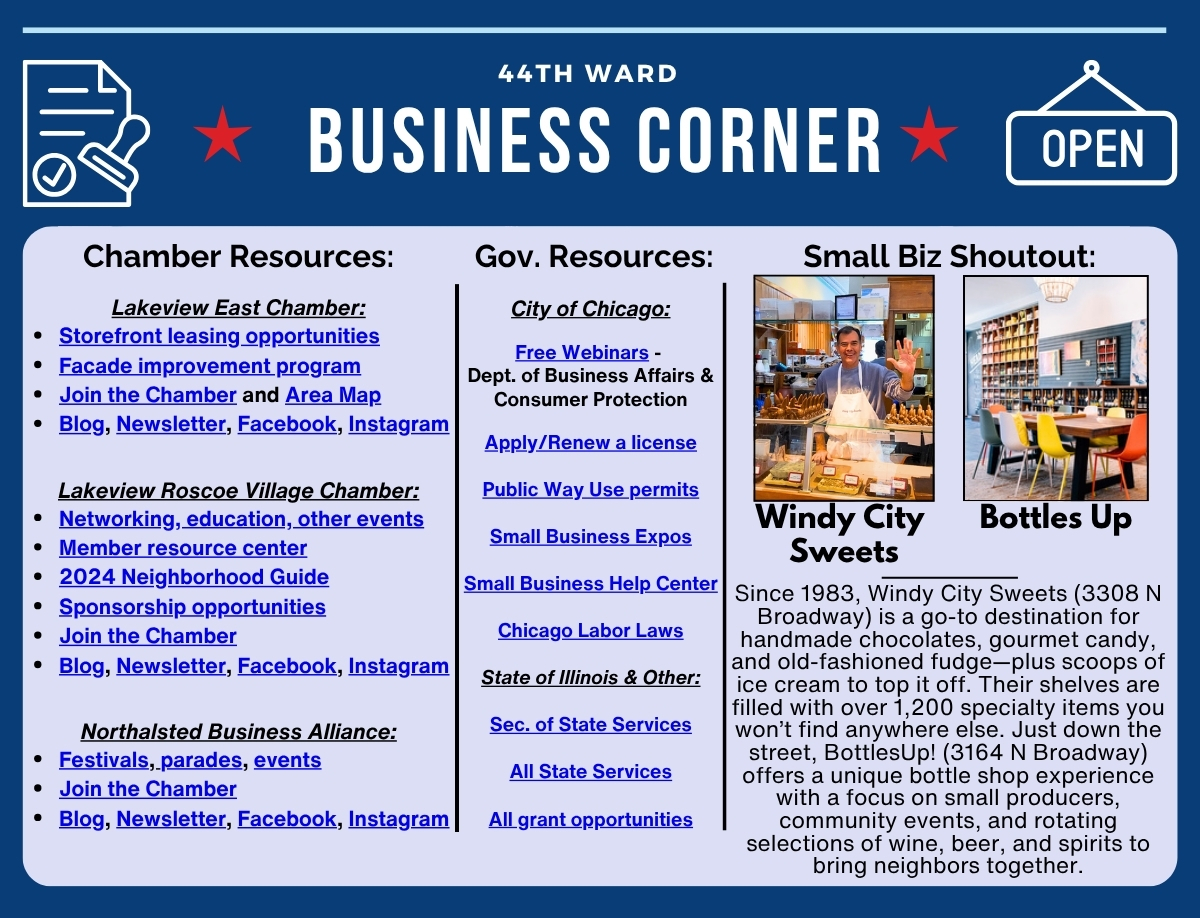 We’re excited to welcome several new and returning businesses to the ward! Dream Creeks (2936 N Clark), a husband-and-wife-owned leather studio, has opened its doors and offers beautifully handcrafted, heirloom-quality pieces. TRUTH Training (3232 N Sheffield) brings a new, inclusive fitness community to Lakeview just across the street from our office where neighbors of all levels can train, grow, and connect.