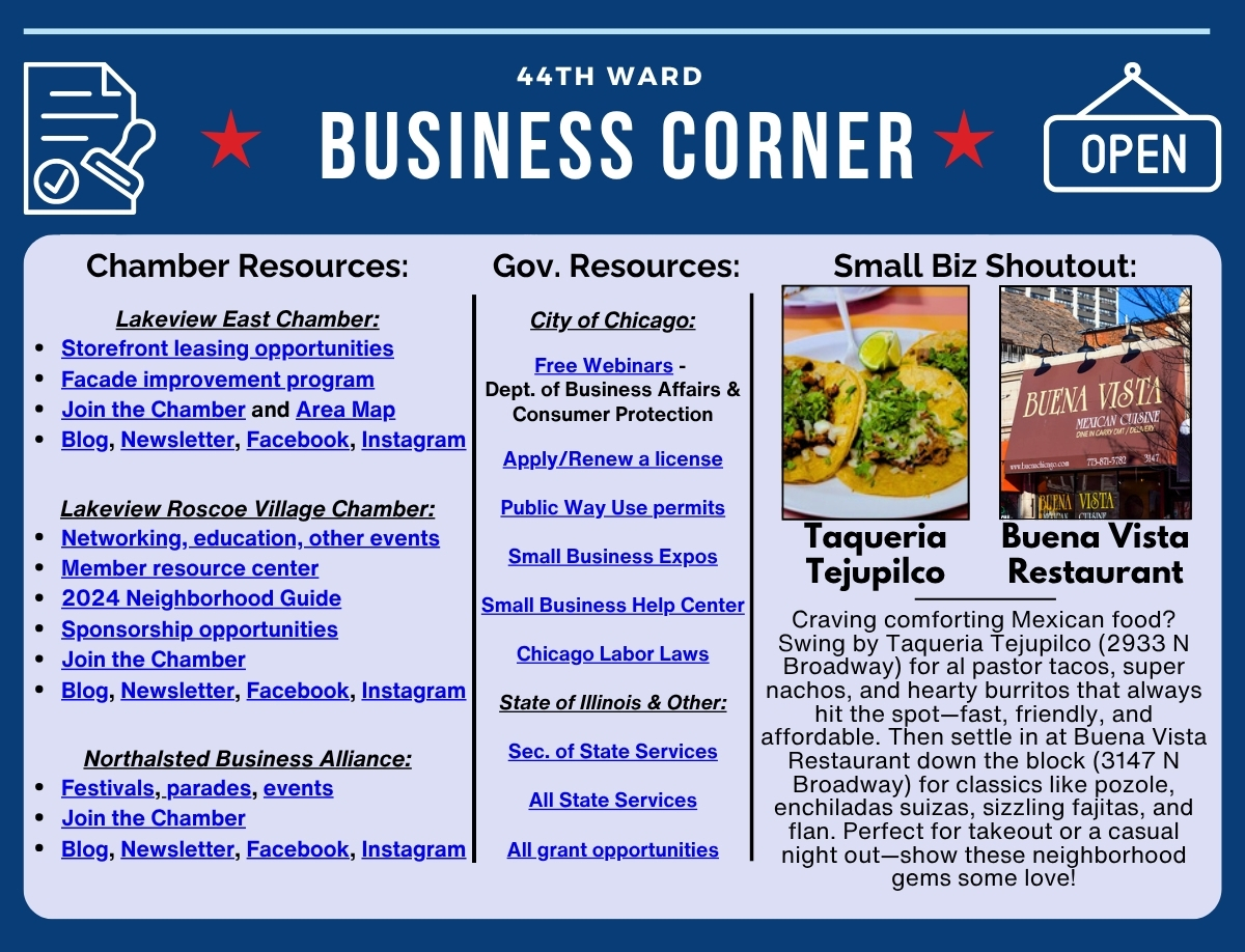 In community news, the Lakeview East Chamber of Commerce has created two handy guides: a 'Haunted Happenings' list of Halloween events across Lakeview East, and a Día de los Muertos guide for celebrations happening this weekend. Be sure to browse their roundups to find family-friendly activities, performances, specials, and neighborhood shops to support. Check out the Halloween guide here and the Day of the Dead guide here.