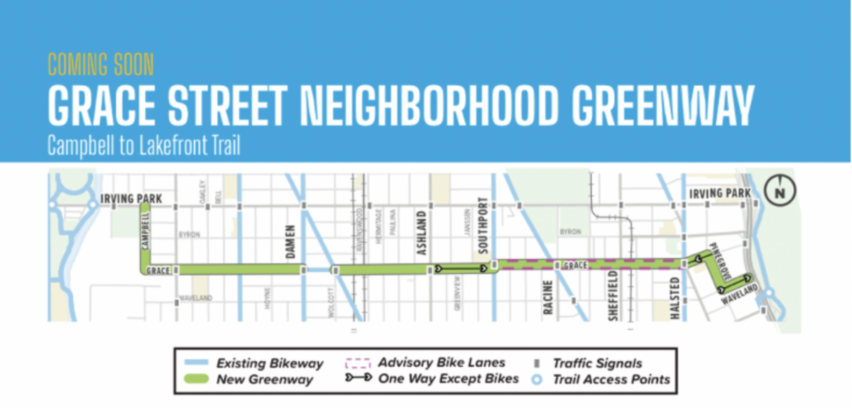 In late April, the Grace Street Greenway will be installed to connect the 312RiverRun Trail to the Lakefront Trail. Once completed, this will be a nearly 3 mile family friendly route to improve access to parks, trails, and destinations like Wrigley Field.