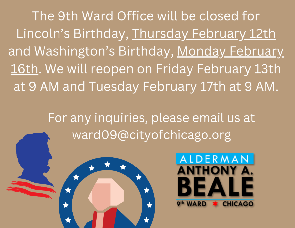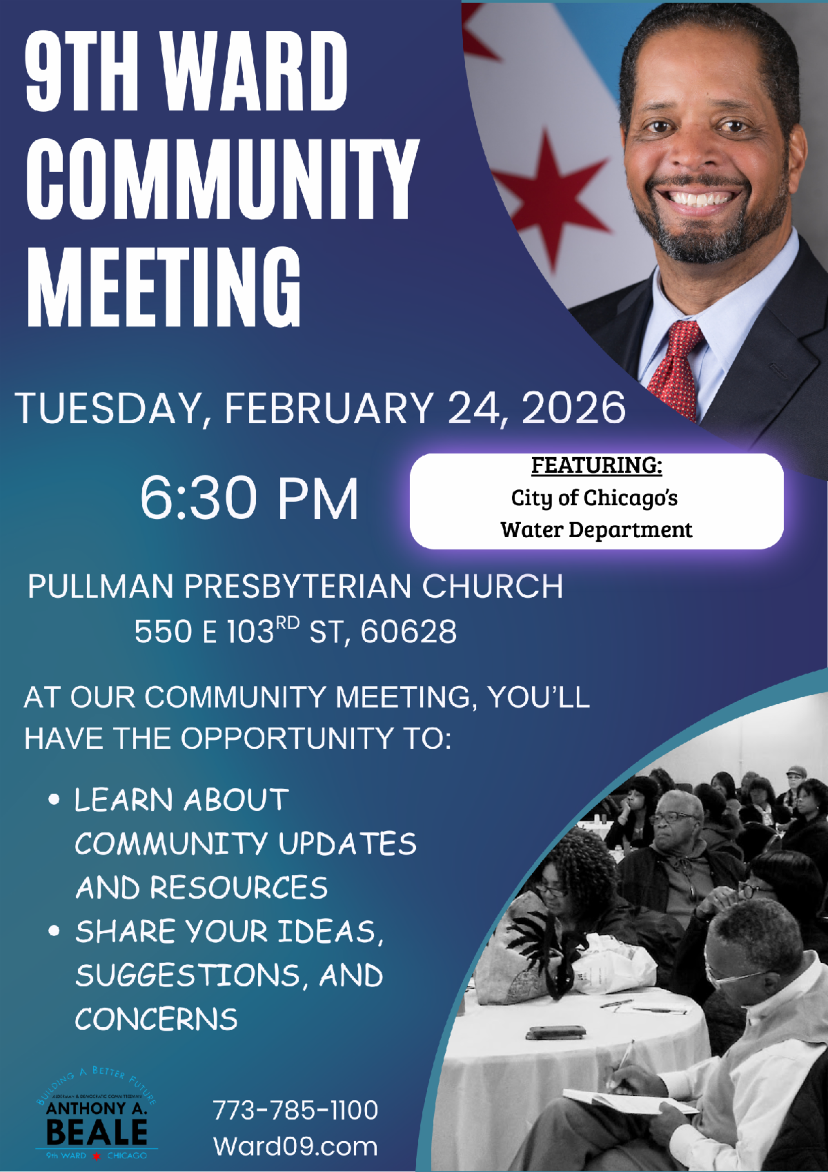 Alderman Anthony A. Beale of the 9th Ward invites residents to a first townhall in 2026 and encourages participation in a survey to shape the upcoming calendar. He highlights CTA opportunities, grant deadlines, and upcoming job, training, and fair events, with registration deadlines through March and April. The newsletter also promotes a Black History Month celebration honoring 100 years of Black Excellence.