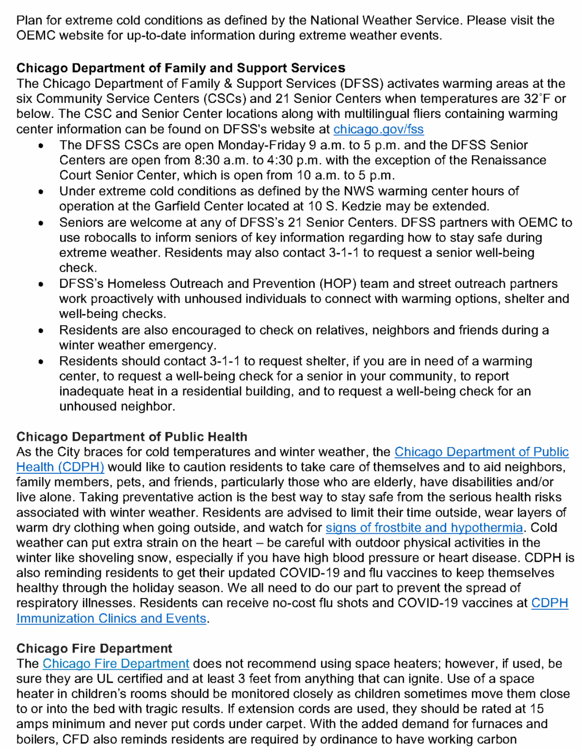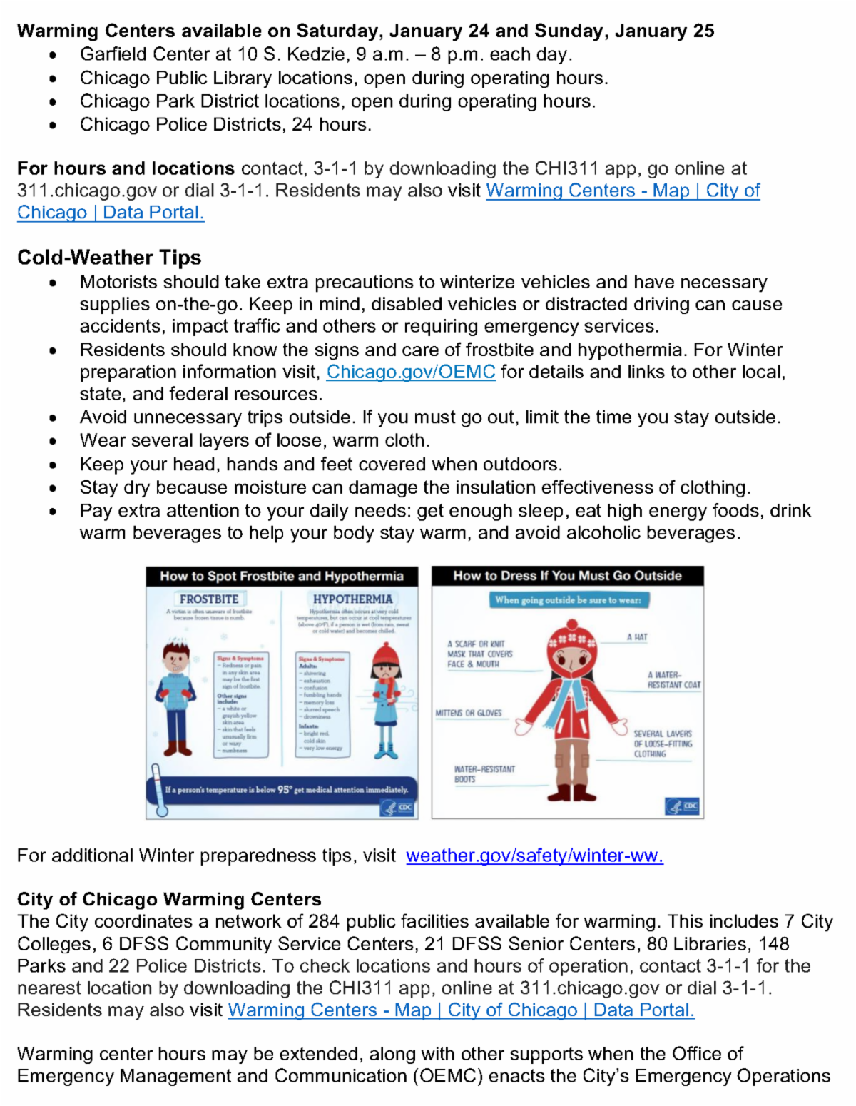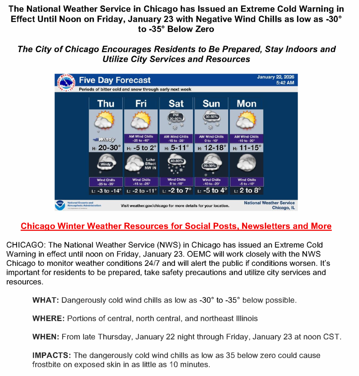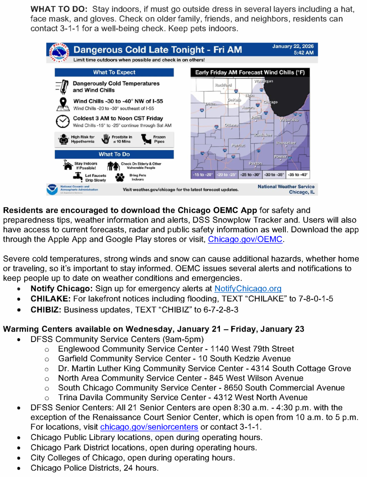 The Aldermanic Office of the Third Ward issued a 1/22/26 e‑newsletter that highlighted an extreme cold weather alert and resources for residents. It also promoted Greater Bronzeville Parent University, the Obama Library, and upcoming community tourism prep sessions. No meetings, policy changes, or development updates were announced.