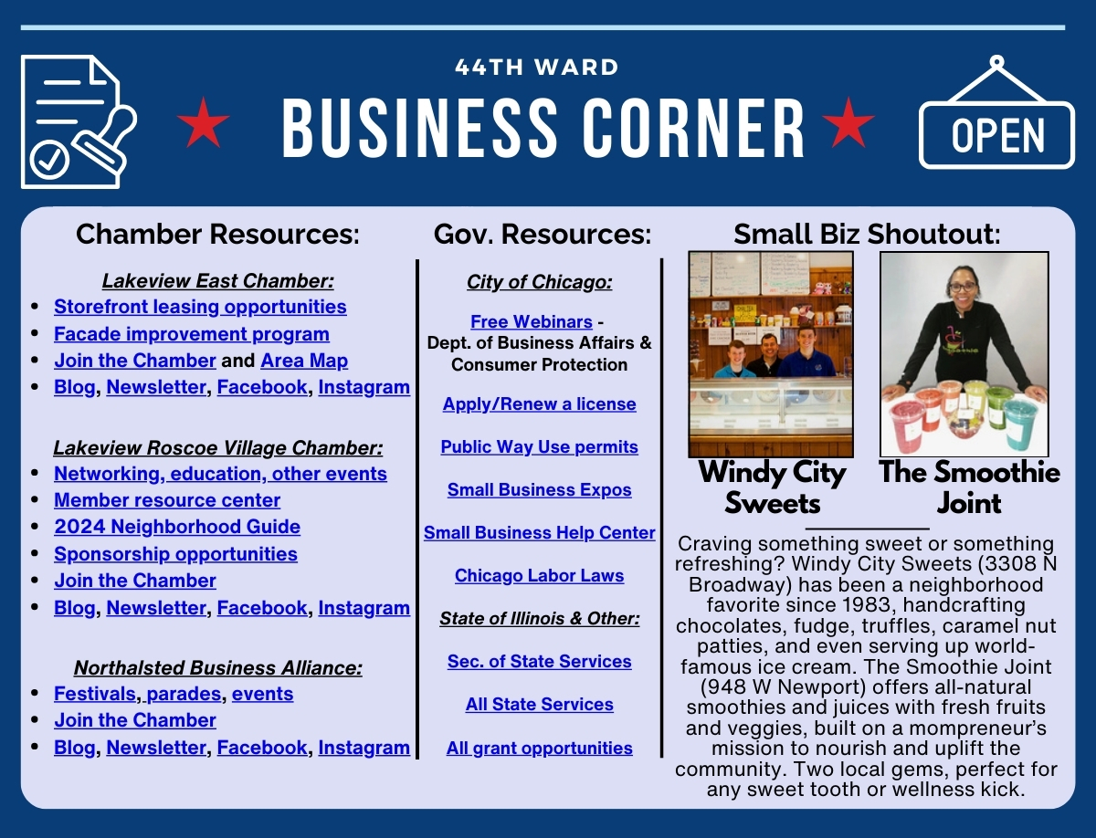 In public safety news, we are aware of a tragic fatal shooting that occurred around 4:00am this past Wednesday in the 700 block of Waveland, just outside our ward. Our office is coordinating with the 46th Ward and the 19th District of the Chicago Police Department as detectives continue to investigate what appears to have been a carjacking that resulted in a heartbreaking loss of life. If you have any information that may assist investigators, please contact the Area 3 Detectives Violent Crimes Unit at 312-744-8261.