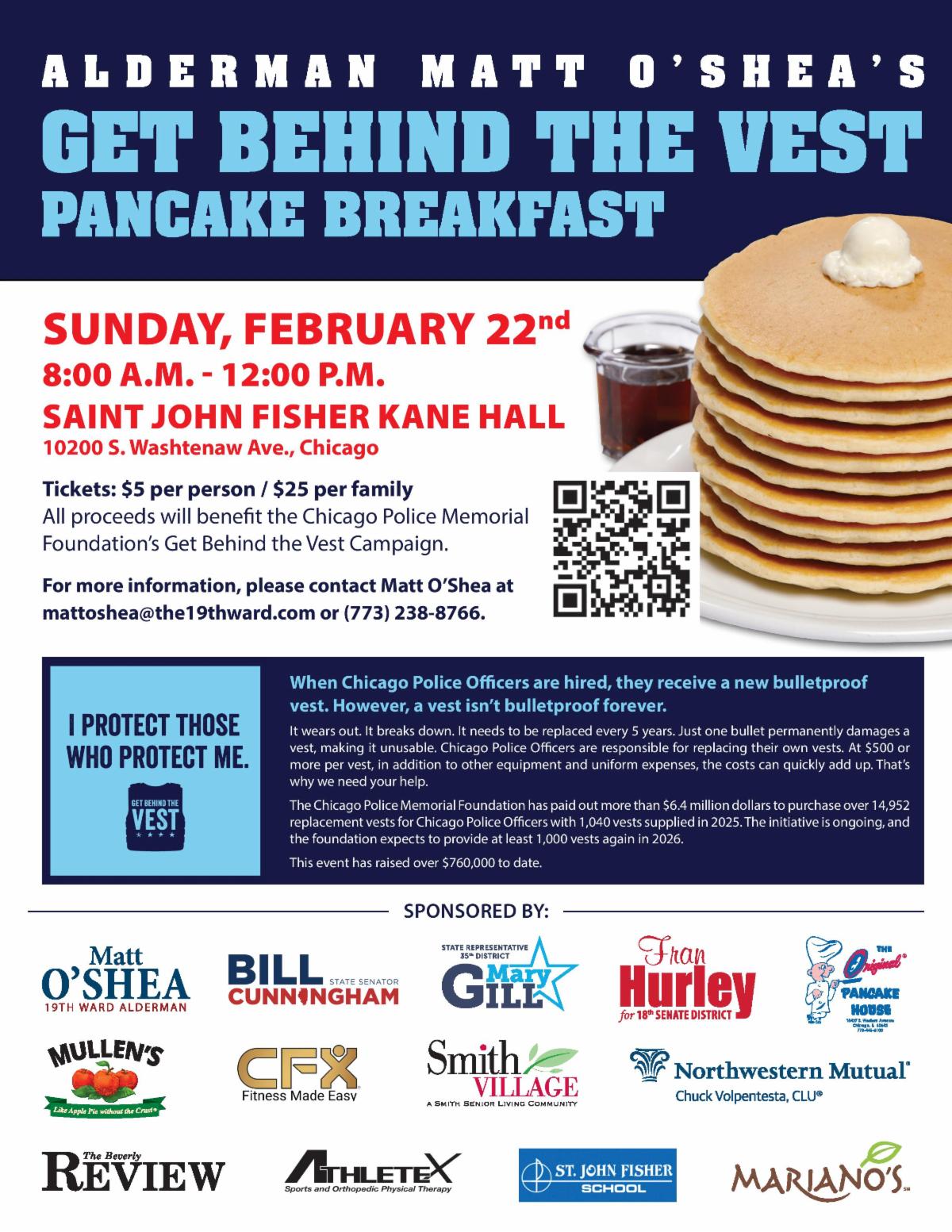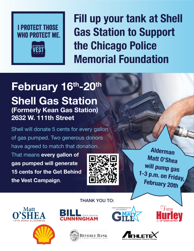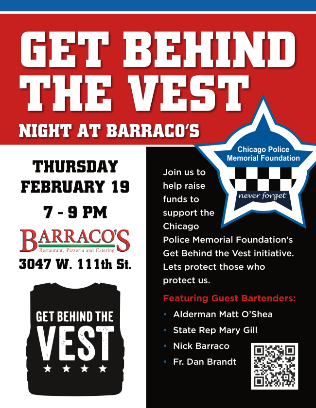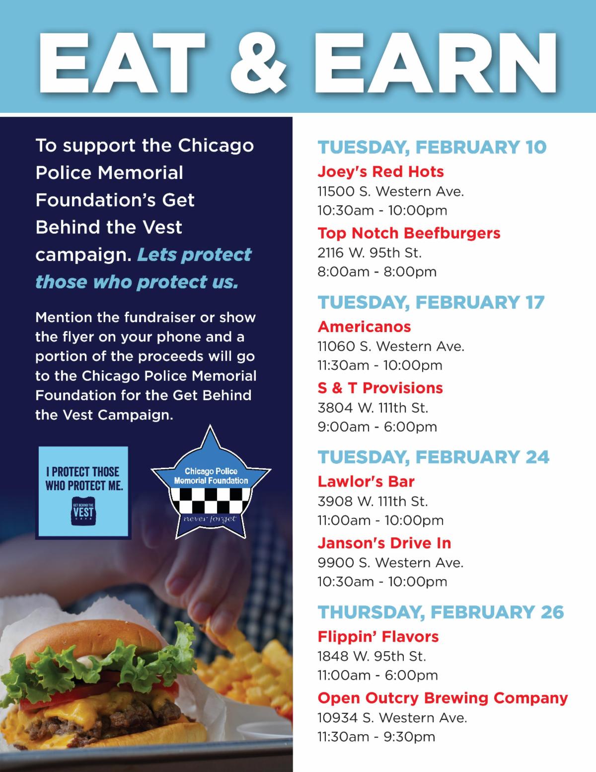 Throughout February, the 19th Ward Office and local businesses are collaborating to support the Chicago Police Memorial Foundation's Get Behind the Vest Campaign. Please mark your calendar today, February 10th, and a portion of sales at either Joey's Red Hots (11500 S. Western Ave.) or Top Notch Beefburgers (2116 W. 95th St.) will benefit the Get Behind the Vest campaign. Please mention the promotion or show the flyer below when placing your order to ensure you are included in the fundraiser.