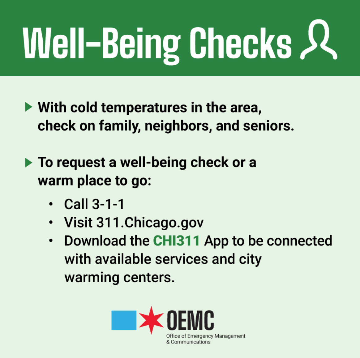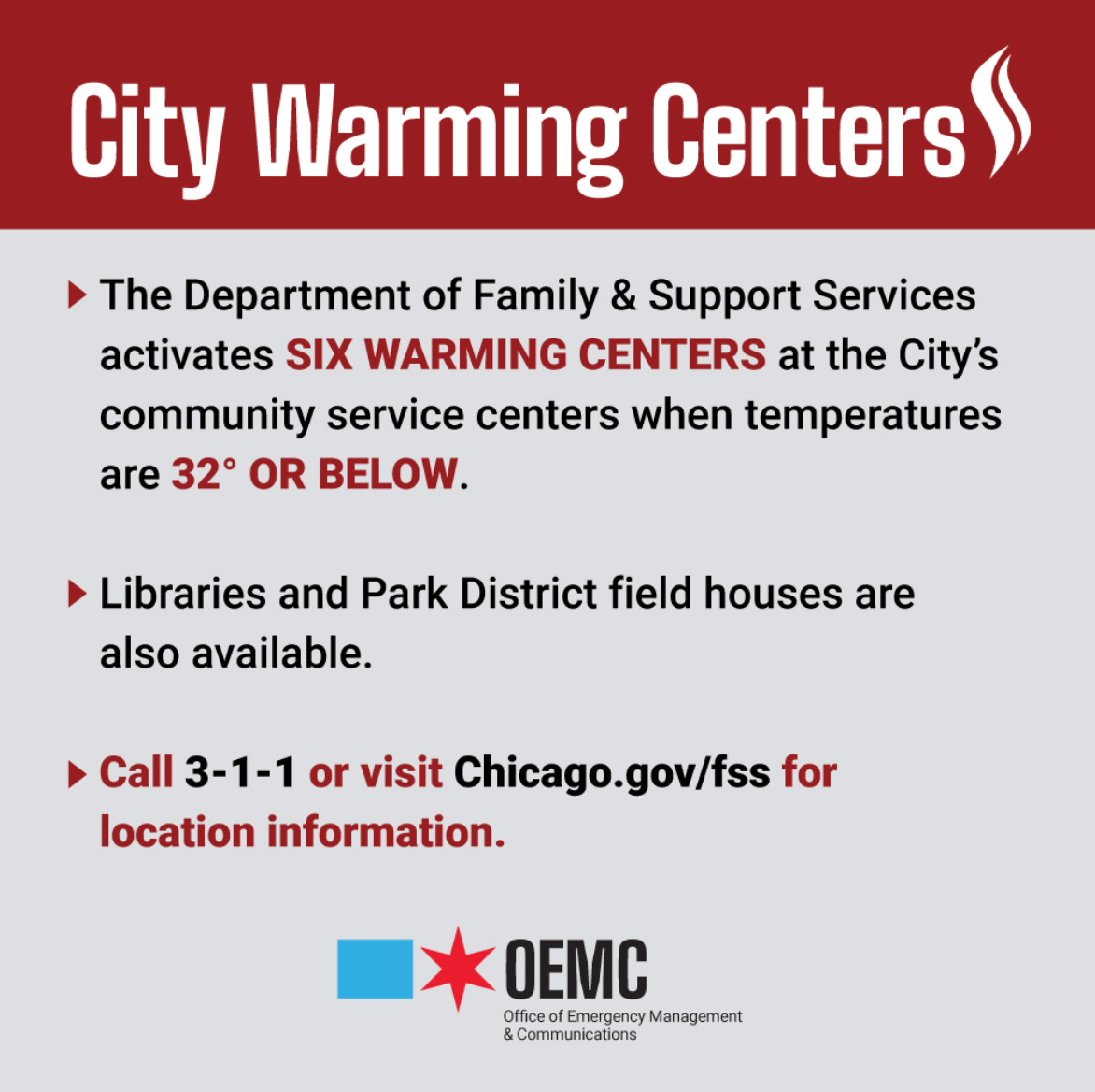 The Chicago Department of Family & Support Services activates warming areas Monday-Friday at the City’s six community service centers when temps are 32˚F or below. Seniors are welcome at any of DFSS’s 21 senior centers. DFSS partners with OEMC to use robocalls to inform seniors of key information regarding how to stay safe during extreme weather. Visit Chicago.gov/Seniors for senior center locations and hours. Those seeking a warm place to go after hours can also call 3-1-1 to be connected with available services.