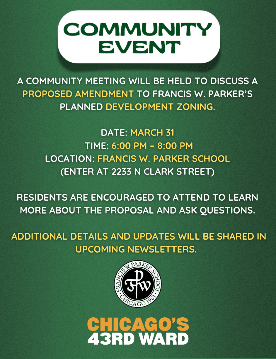 As a reminder, please join us tonight Tuesday, March 31st, from 6:00 - 8:00pm for a community meeting our office is hosting regarding the proposed amendment to Francis W. Parker School’s Planned Development. We anticipate strong attendance and encourage all who would like to learn more to attend. As always, there is no need to RSVP.