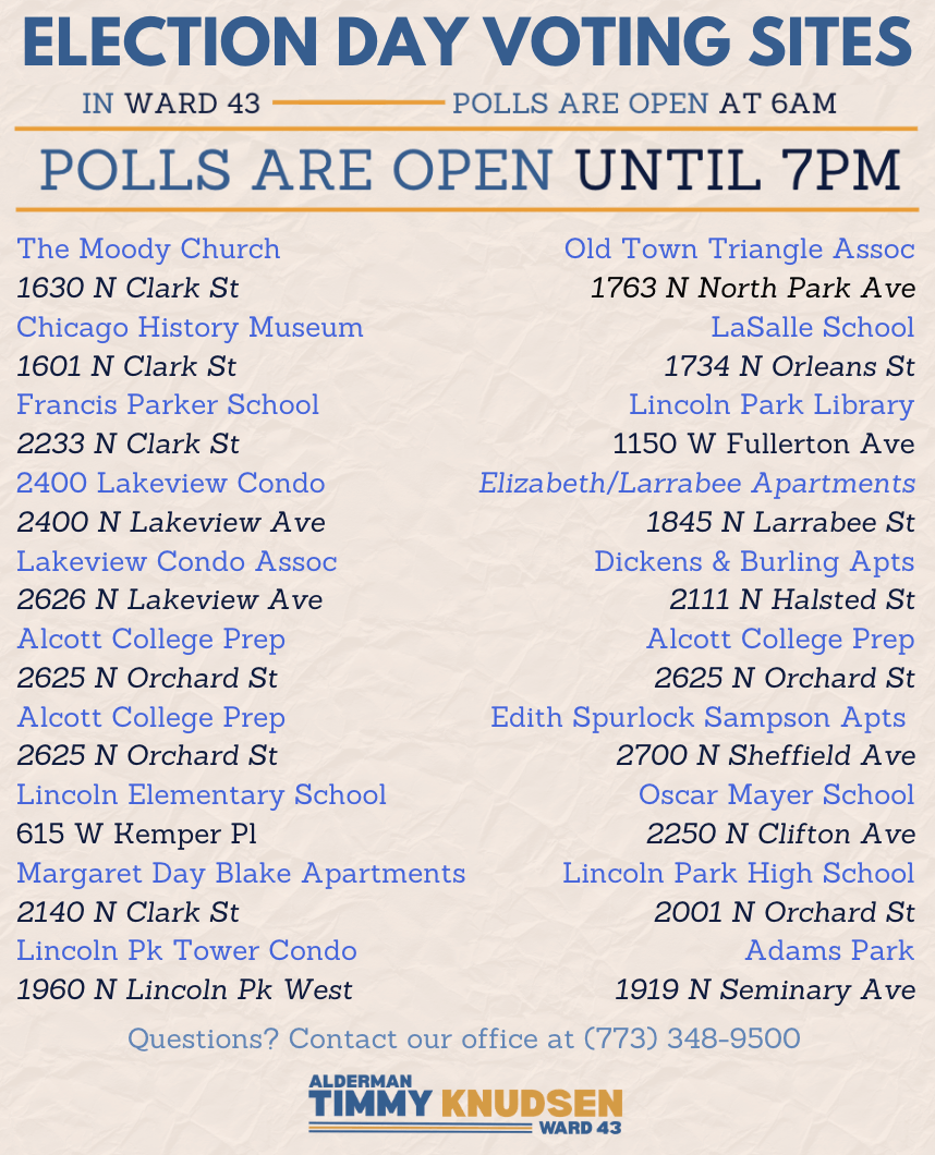 Alderman Timmy Knudsen of Chicago’s 43rd Ward reminds residents that Election Day is March 17, 2026, and polls will be open until 7 p.m., with multiple precinct sites, the Lincoln Park Library, and a supersite at 137 S. State St. available for voting. The newsletter provides detailed instructions for in‑person voting, early voting, mail‑in ballots, and voter registration, along with contact information for the ward office and links to state and federal voting resources. No zoning, development, or budget updates are included; the focus is solely on voter information and election logistics.
