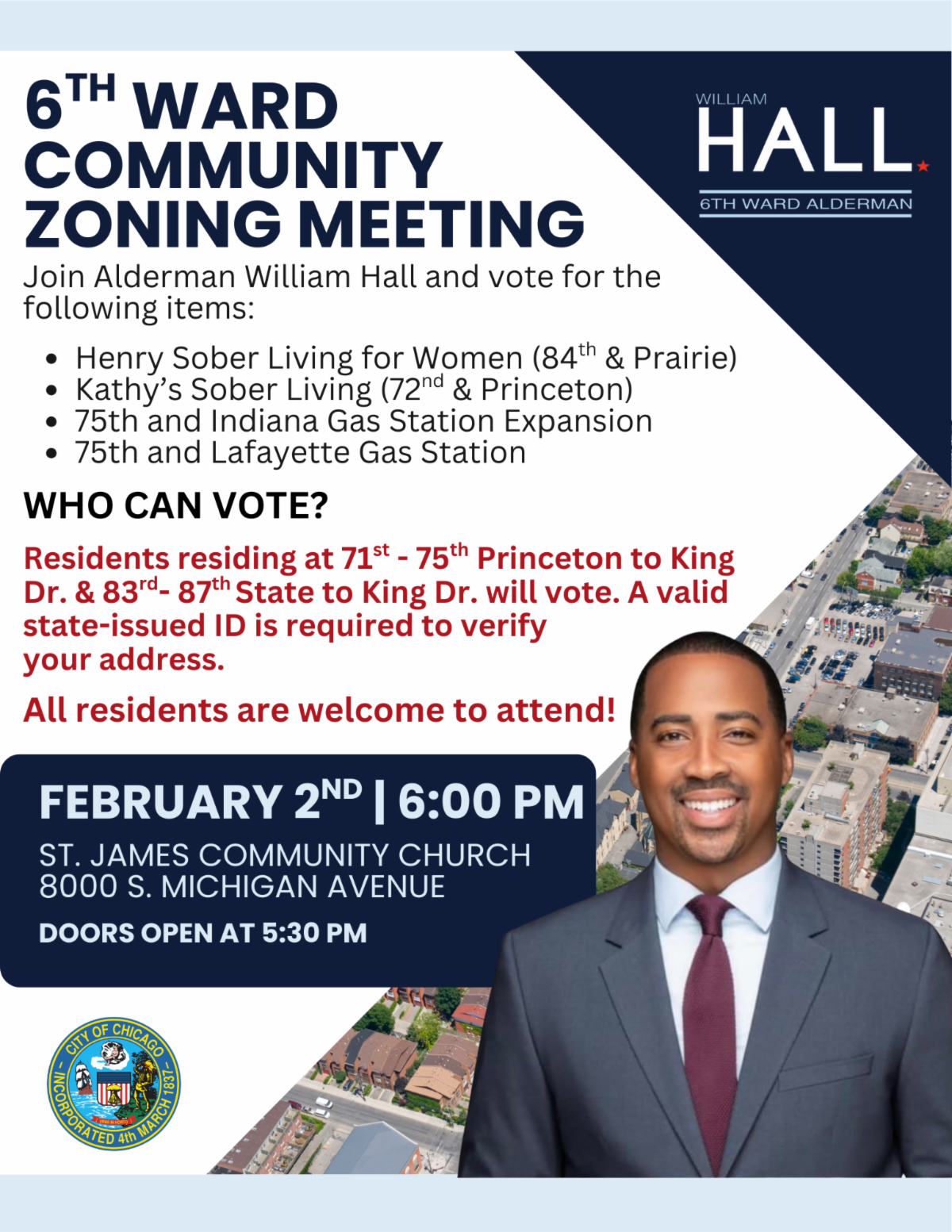 This is a friendly reminder to join us tomorrow, Monday, February 2nd, for the 6th Ward Community Zoning Meeting. This meeting is an important opportunity for residents to stay informed, ask questions, and participate in decisions that impact our community.