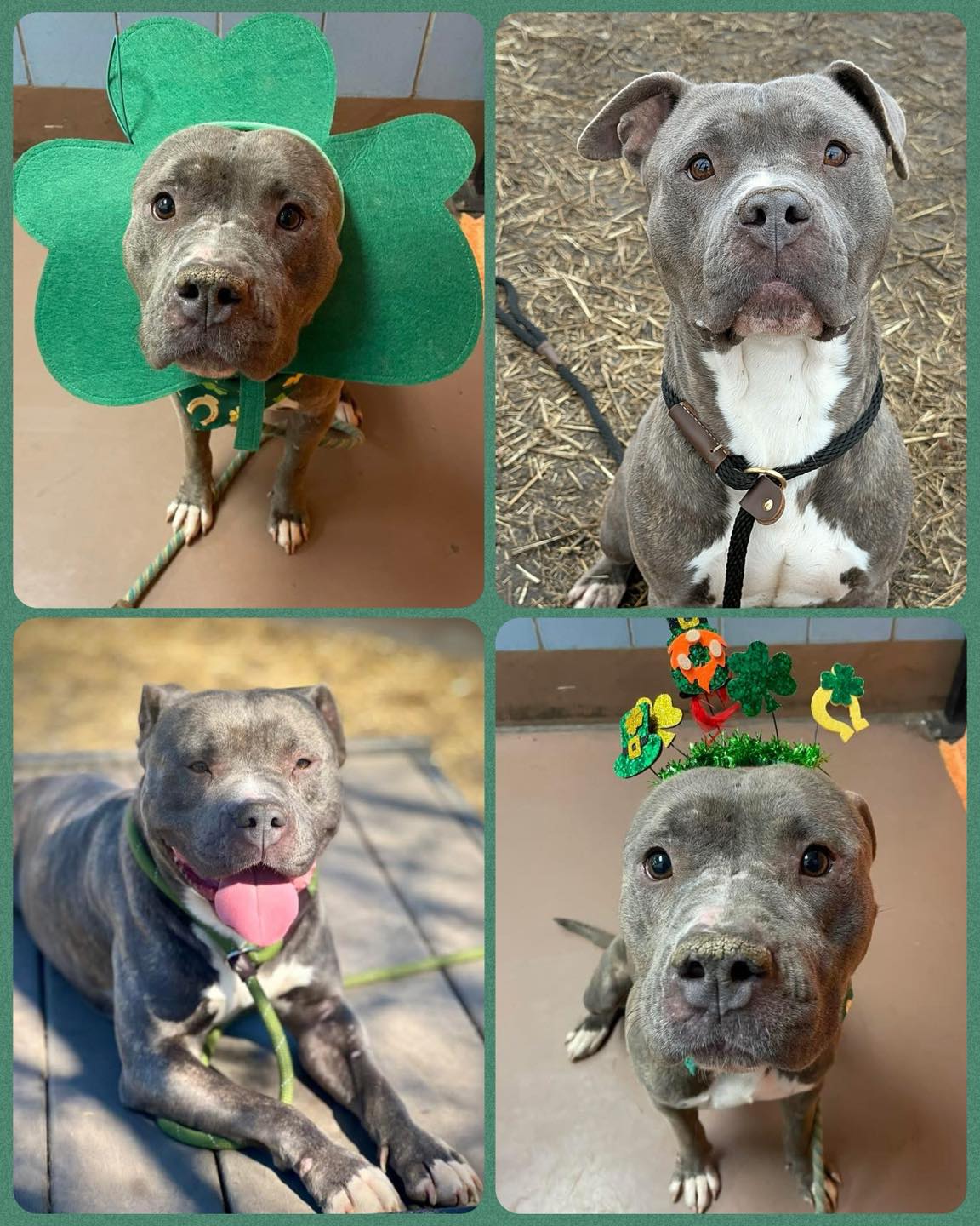Although he arrived in rough shape, these days he's healthier and getting lots of love from his volunteer friends. Slater is sweet, smart, snuggly and playful. He loves being close to his people even if it means dressing up like a shamrock to do so! To see Slater in action, click HERE and HERE.
