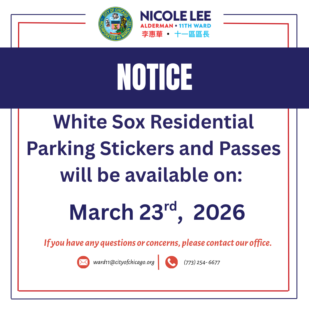 White Sox passes and decals are available in the office for those who have not received them at home. If your vehicle is registered with the City within the Sox Residential Zone, you should have received them in the mail by now, if you haven’t, please stop by with an ID or proof of address if your address is not up to date on your ID.