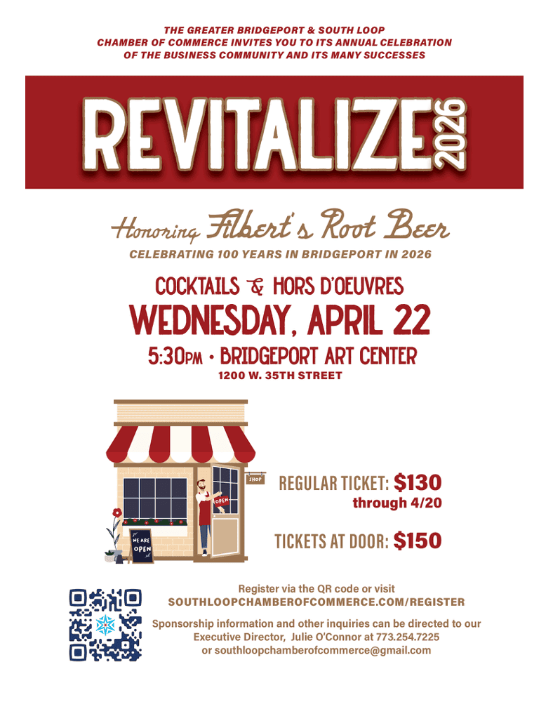 The Greater Bridgeport & South Loop Chamber of Commerce will hold its annual REVITALIZE Gala on Wednesday, April 22nd at the Bridgeport Arts Center. The chamber will honor Filbert’s Root Beer on their 100th Anniversary! Learn more or buy tickets here..
