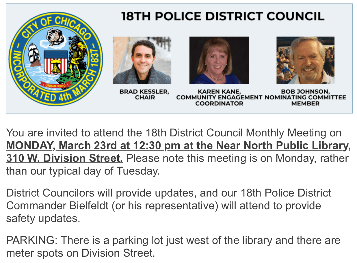 Street sweeping season officially begins on April 1st, when sweepers will return on a regular basis throughout the ward. The Department of Streets and Sanitation will post warning signs 48 hours in advance, so please remember to move your car to avoid a ticket and help ensure our streets are properly cleaned. Click here to see the block-by-block April and May schedule.
