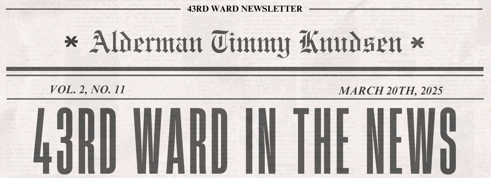 Our 43rd Ward Volunteer Corps has hit the ground running to the benefit of our community. Next week, our Volunteer Corps will launch a new civic workshop series called “How It Works,” beginning with its first episode “Block Talk on Tap: What is a Ward?” Whether you are new to the ward, or have been here for decades, this event will break down how local government operates and provide residents with practical tools to engage more effectively. The event is hosted by our hardworking 43rd Ward Volunteer Corps, and as a fun bonus, this event will feature remarks from former 43rd Ward Alder Michele Smith in my stead. Register for the Block Talk event here, and sign up for 43rd Ward Volunteer Corps updates and opportunities here.