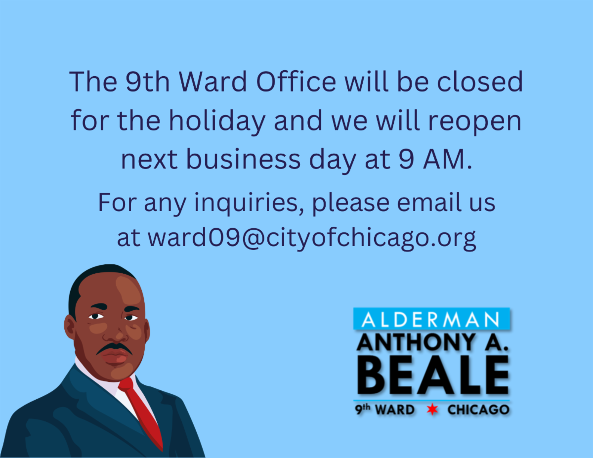 Alderman Anthony A. Beale of the 9th Ward reports no upcoming meetings, policy changes, or development approvals related to zoning, housing, transit, or budget. He announces a new newsletter schedule, a community survey to shape the 2026 calendar, and several bid and qualification deadlines (January 17, January 23, February 3, February 6). The office also highlights upcoming events and resources for residents.