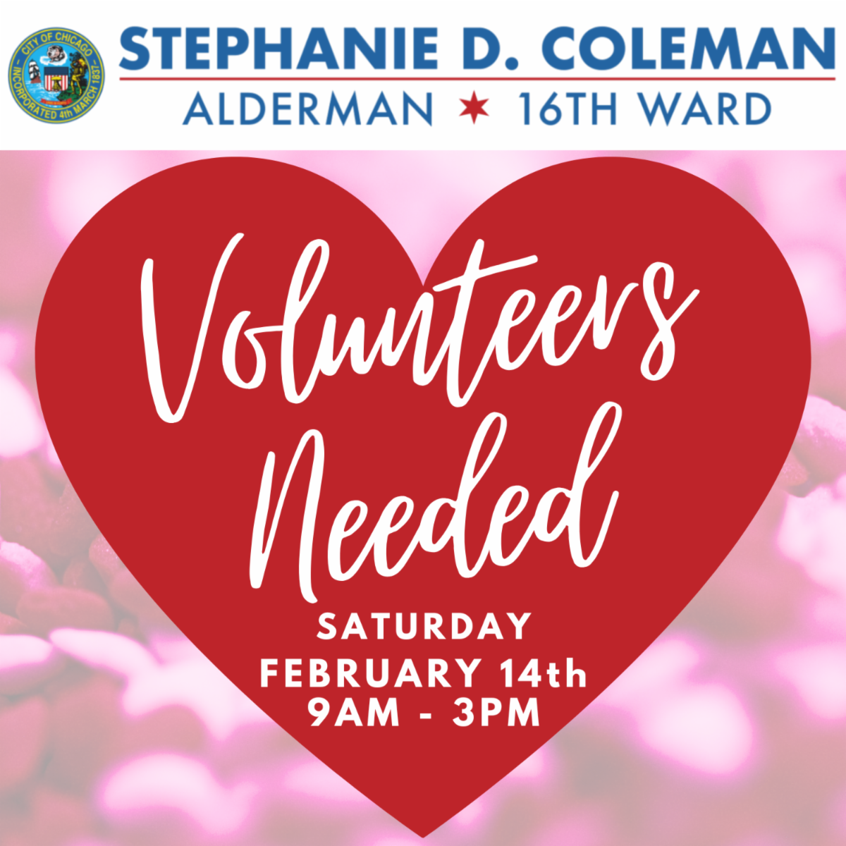 Alderman Stephanie D. Coleman reports no upcoming zoning, development, housing, transit, or budget meetings or policy changes for the 16th Ward this month. The 16th Ward Service Office is calling for volunteers to help host the 2026 Seniors and Veterans Valentine’s Day Luncheon. Office hours remain Monday‑Friday as listed.