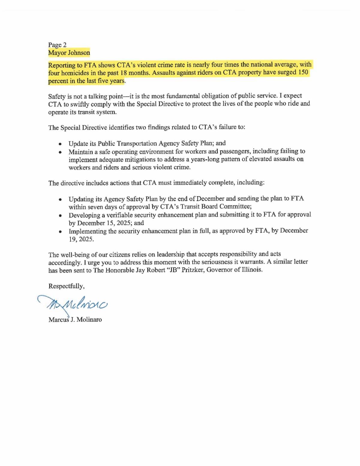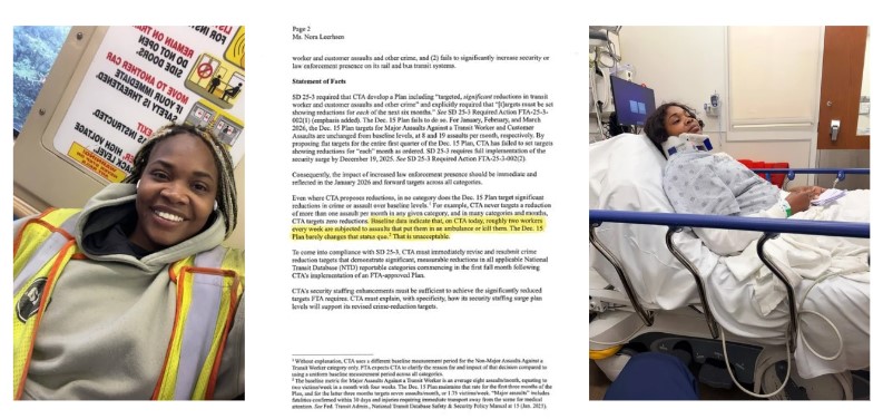 | | "Roughly two CTA workers every week are subjected to assaults that put them in an ambulance or kill them. The Dec 15 CTA Safety Plan barely changes that status quo. That is unacceptable." Federal Transit Administration (FTA) | | |
