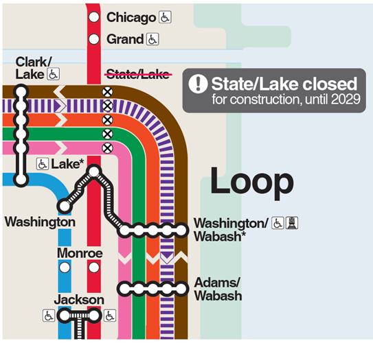 Please use the accessible Clark/Lake or Washington/Wabash stations, located within a few blocks of the State/Lake station. To transfer between the Red Line at Lake station and the Loop ‘L’ lines, use Washington/Wabash.