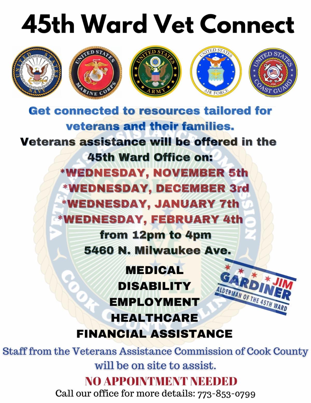 | | Thank you for being part of the 45th Ward community. We are grateful for the opportunity to serve you and remain dedicated to providing exceptional constituent services. | | The Cook County Veterans Assistance Commission visits our office each month to assist veterans in our community. If you or someone you know is a veteran in need of support or has questions, please feel free to stop in. | | Each week, we will highlight a different service offered by the Cook County Veterans Assistance Commission. | | MATURING RESIDENTS IN THE 45TH WARD | | |