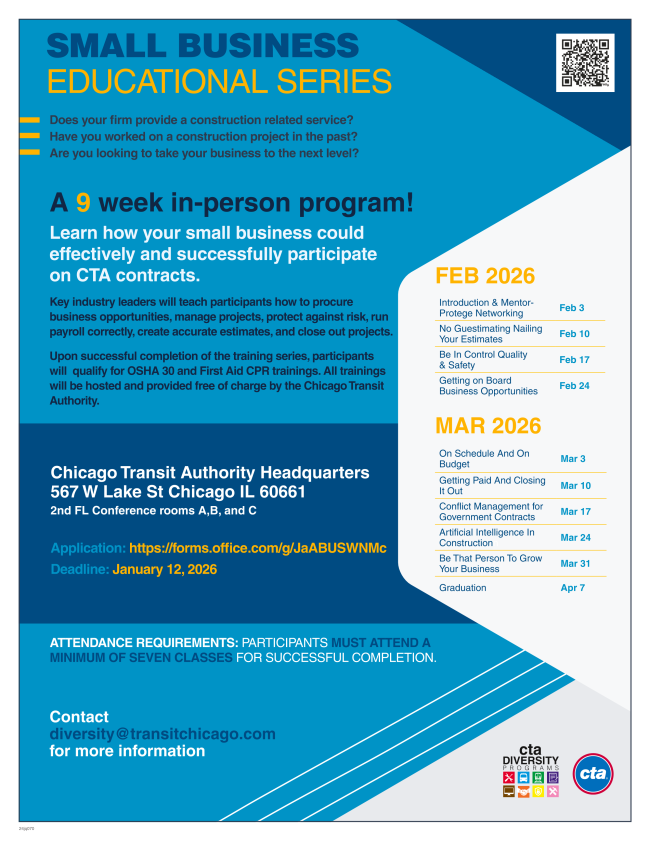 The Chicago Department of Business Affairs & Consumer Protection (BACP) Entrepreneur Certificate Program is a free and optional program available to attendees of the free BACP business education webinar series. The program is designed to give entrepreneurs the essential information they need to start and grow a business in Chicago. The program’s curriculum covers essentials in business planning, financing, marketing, legal topics, technology, and more. Click here for additional information