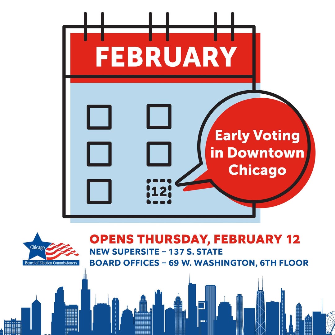 Early Voting for this year's primary election begins on Thursday, February 12th at the downtown Supersite at 137 S. State St. and on the sixth floor at the Chicago Board of Elections offices at 69 W. Washington.