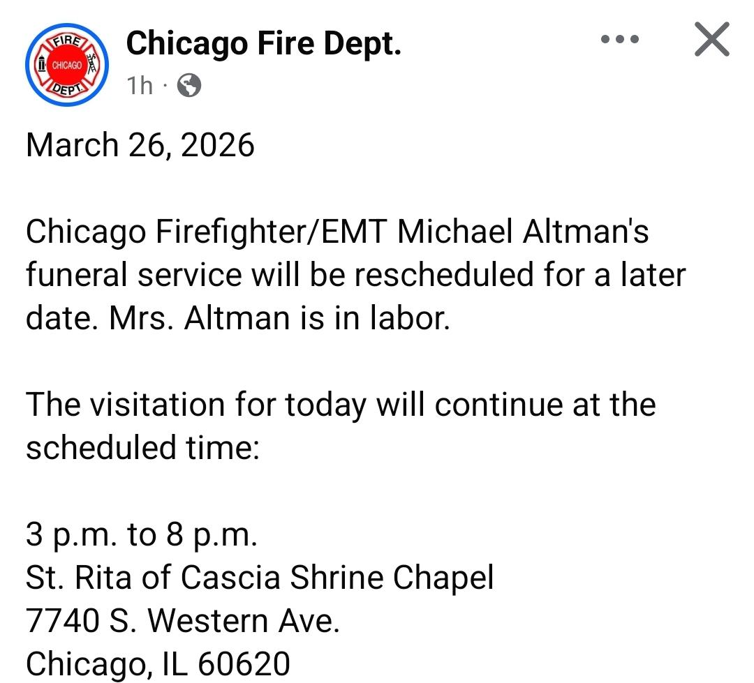 Due to the delivery, funeral services for Michael Altman will be postponed until further notice. Our office will share updates as additional details become available.