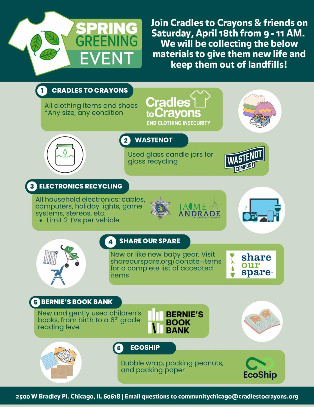 Stop by in your car, and volunteers will unload personal electronics, office/industrial equipment, kitchenware, small furniture items, and more. We work with tech recycling and charity partners to either recycle or donate items to Chicagoans in need! Click here for more information.
