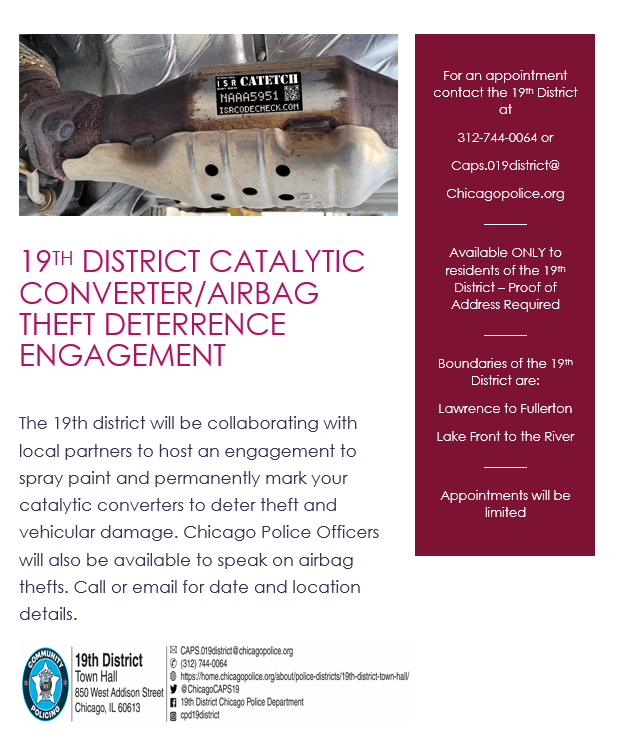 There were 39 theft to vehicles including 6 of vehicles themselves. 10 were of Honda airbags; there is a vehicle safety event for 19th District residents this Saturday; please see flyer below and make sure to make a reservation with the 19th CAPS office as spaces are limited.