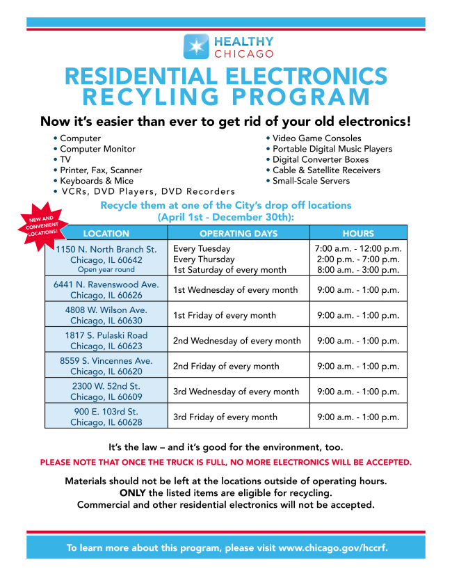 Stop by in your car, and volunteers will unload personal electronics, office/industrial equipment, kitchenware, small furniture items, and more. We work with tech recycling and charity partners to either recycle or donate items to Chicagoans in need! Click here for more information.