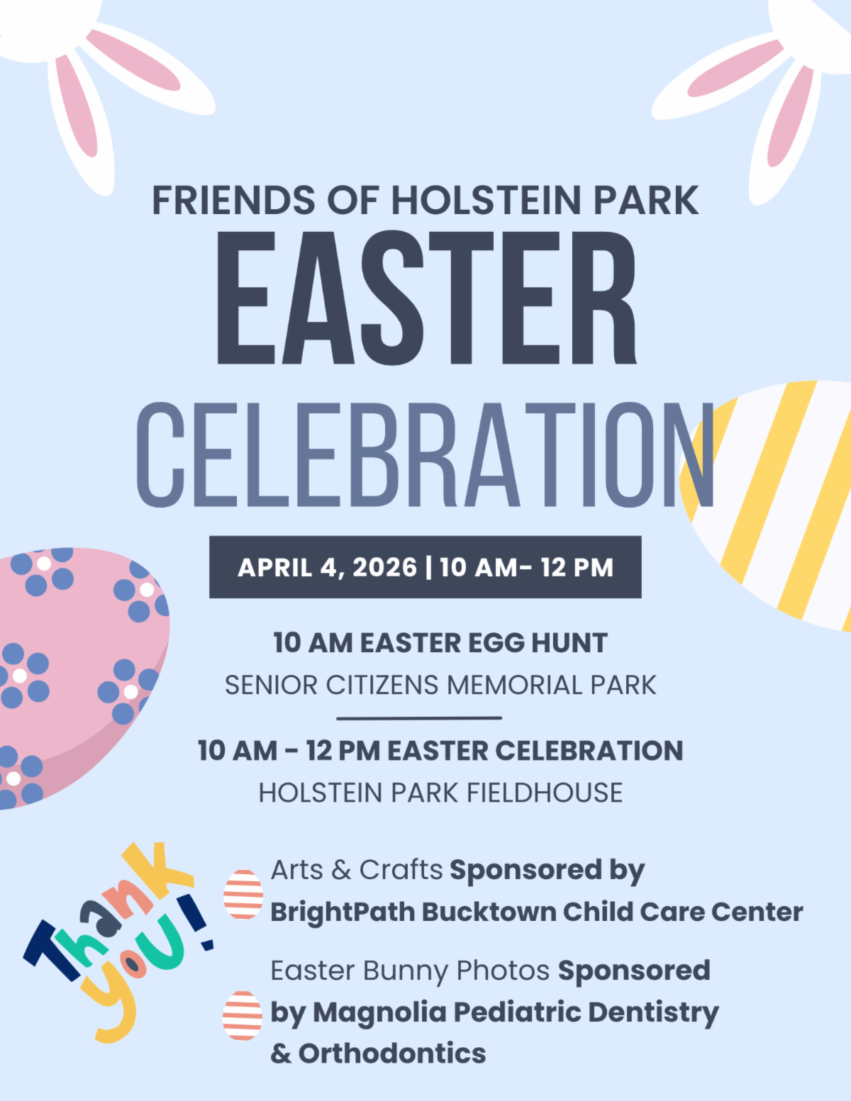 - Easter Bunny photos & community fun @ the Holstein Park Fieldhouse (10am-12pm)