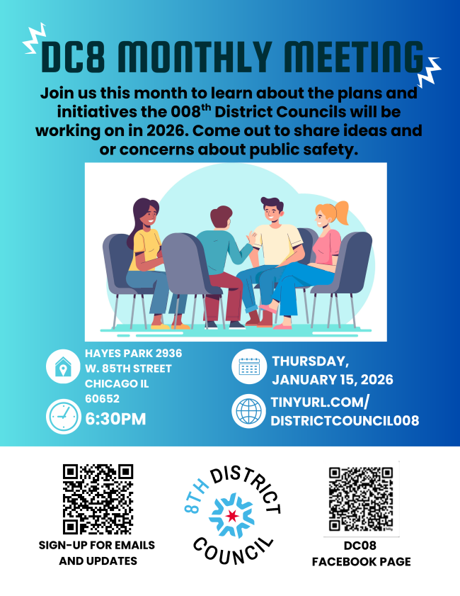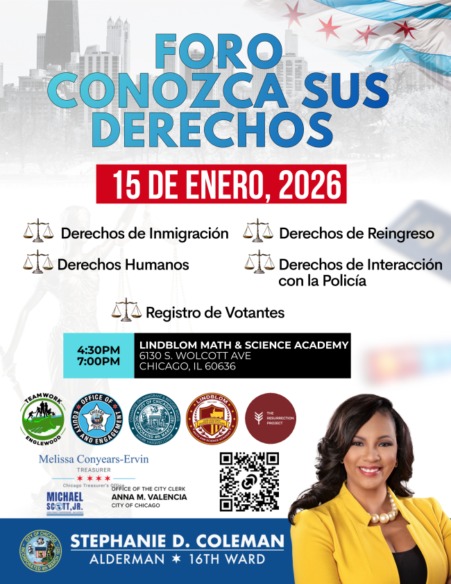 Alderman Stephanie D. Coleman’s January 2026 16th Ward newsletter does not mention any meetings, hearings, policy changes, development approvals, budget decisions, transit service changes, or street safety projects. It highlights the ward’s service‑office hours, volunteer sign‑up opportunities, voter registration, and resources for seniors, veterans, and property owners. The newsletter also lists police‑district coverage and community‑event information.