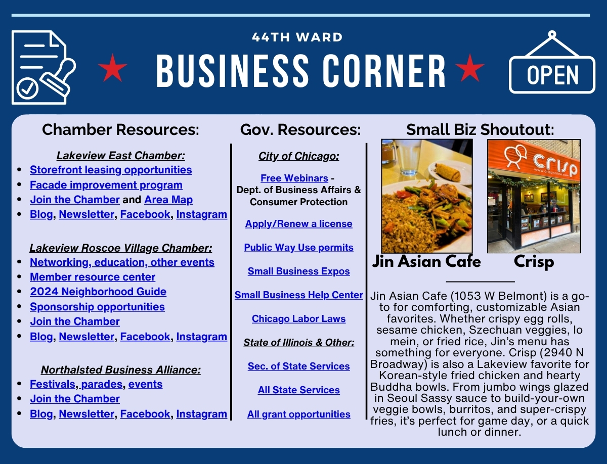 This past week, we were excited to welcome two new small businesses to the ward! Tso Good (843 1/2 W Belmont, formerly Café Flamingo) is back with a fresh look, crispy chicken sandwiches, and fruit smoothies—and tomorrow they’re hosting a food drive where you can “bring a can, get a wrap” to support neighbors in need. Bring a non-perishable food item and get a free chicken wrap. See the flyer here. Just down the street, Hot Chi Chicken (953 W Belmont) is bringing its viral Nashville-style hot chicken and creative specials to Lakeview East, and we’re thrilled they chose our community for their latest location.
