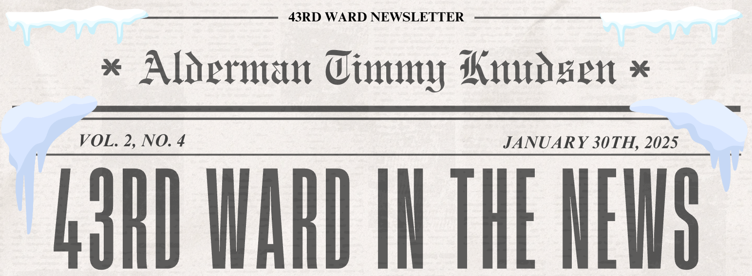 P.S. Thank you to Erik Heitman and Eudice Fogel for their years of service and dedication to the Lincoln Central Neighborhood Association. Through their consistent leadership, Erik and Eudice have made the 43rd Ward an even better place to live. As the year begins, we sincerely thank our neighborhood associations & all residents who are involved with them.
