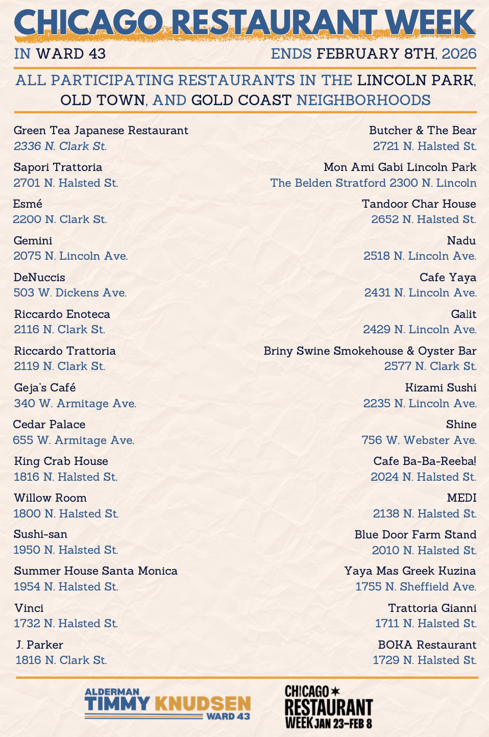 In closing, Chicago Restaurant Week is underway and runs through February 8th, celebrating our city’s incredible food scene. Hundreds of restaurants are offering special menus and pricing, including more than 70 spots in Lincoln Park, Gold Coast, and Old Town. Find the full list and search by neighborhood, cuisine, or dietary needs at this link.