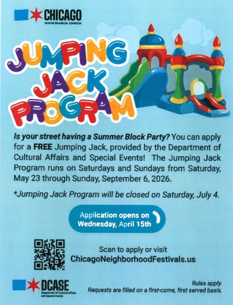 Alderman David Moore of the 17th Ward announces the start of the 2026 Summer Block Club Season, with party packets available from April 1, 2026. Residents whose blocks are not chartered must circulate a petition to host a summer block party. Additionally, the City of Chicago’s Free Jump & Jack Program opens on April 15, 2026, and applications are now accepted.
