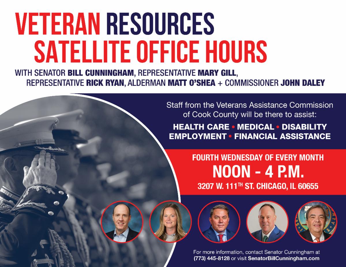 The Veterans Assistance Commission of Cook County will be at the 19th Ward Office (3207 W. 111th St.) from 12:00-4:00pm tomorrow, January 28th, to assist our military veterans and their families with disability related issues, financial assistance, and healthcare questions. Please remember to bring your DD-214 and a valid driver's license or state ID. Please see the flyer below for details.