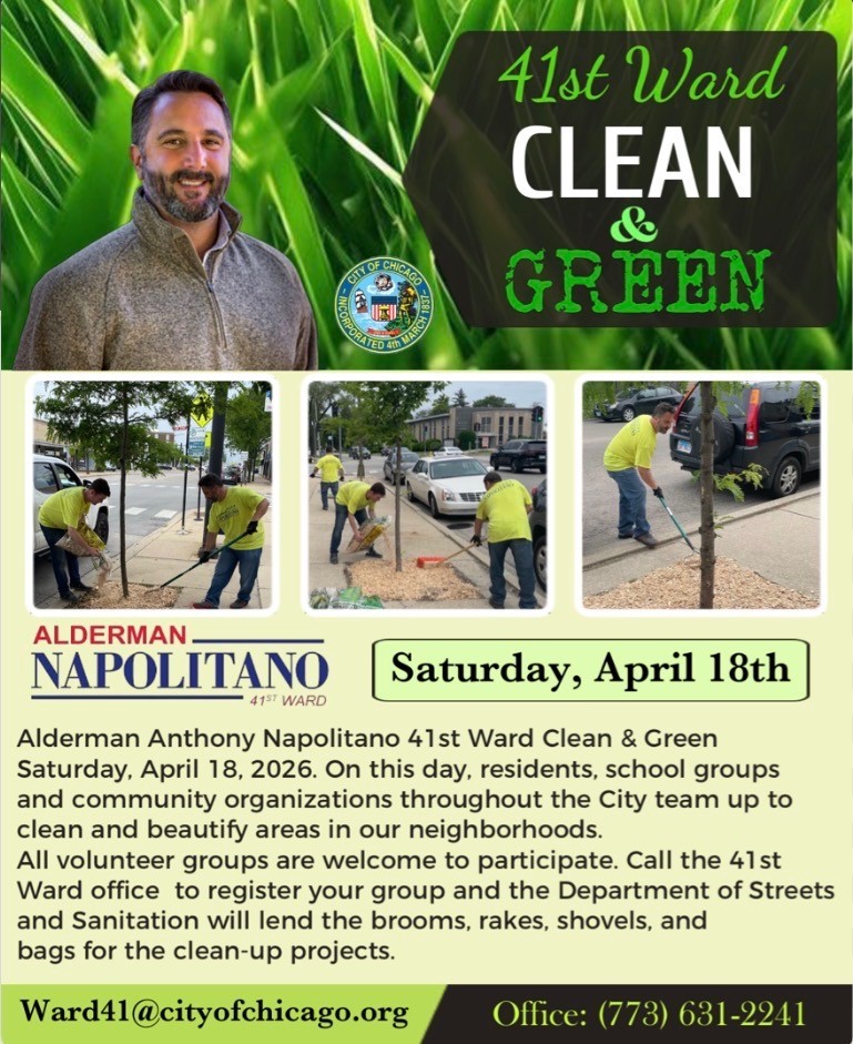 I invite local organizations, schools, block clubs, and community groups to participate in the 41st Ward’s Clean & Green Day of Service on Saturday, April 18, 2026. This citywide initiative is a wonderful opportunity for groups to make a meaningful and visible impact while enhancing the beauty of our shared spaces.
