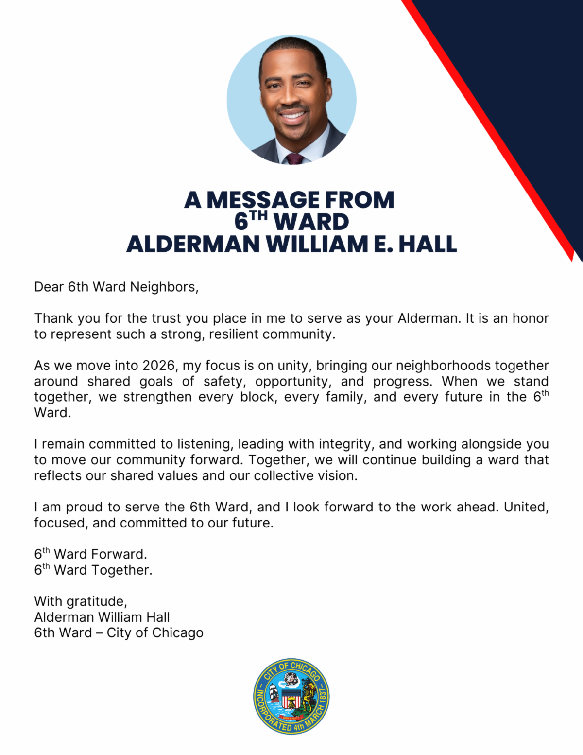 I am grateful for partners like Mather at The Cov, whose mission is to bring at least 1,000 adults over 55 from the 6th Ward into their programming; the Capital One Shine Bright Community Center, which is supporting our efforts to bring more jobs into the ward; and Advocate Health, which is helping ensure we are living whole and well this year. These are just a few of the cornerstones helping make progress possible and nourish the beauty that lives in the 6th Ward. To me, leadership means listening, responding, and acting with integrity. That is the standard I will continue to hold myself to.