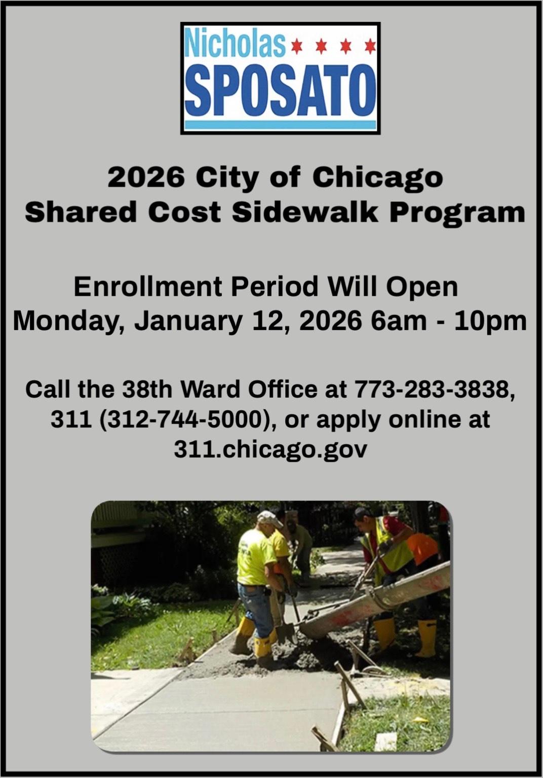 Don't forget the Shared Cost Sidewalk Program opens Monday, January 12th at 6:00am and closes at 10:00pm. The Shared Cost Sidewalk Program is an extremely popular voluntary program in which property owners share the cost of sidewalk repair with the City. Thousands of Chicagoans have been a part of this program, taking advantage of the low cost, exceptional value, and ease of participation.