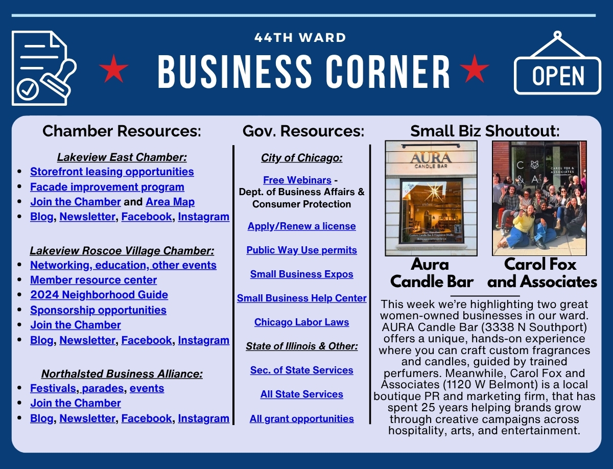In public safety news, the 19th District Police Department is launching a district-wide Court Advocacy Program to support victims of crime and strengthen community partnerships. Many of our residents have been involved in similar efforts through our 44th Ward court advocacy efforts over the past several years, and we’re grateful for their continued commitment to standing with victims. Whether this would be your first time volunteering, or you are an experienced court advocate looking to do more on a broader, district-wide level, we encourage you to explore this new program. It will offer opportunities to receive training, and work directly with CPD and the State's Attorney's Office—see their flyer here for more details on how to participate.