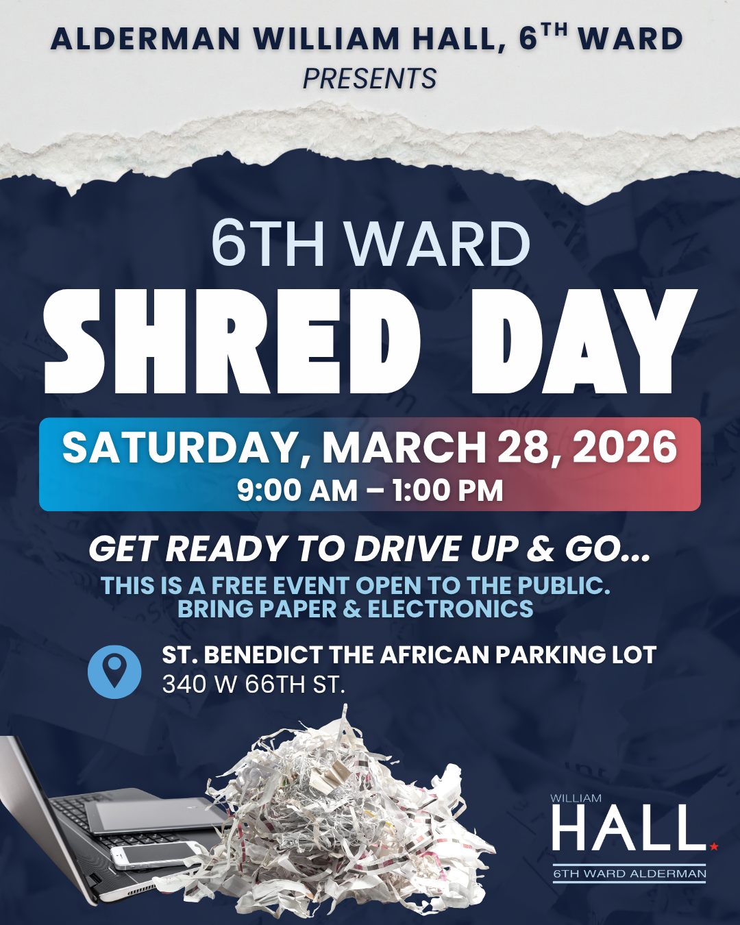 Join us for our upcoming 6th Ward Shred Day, a free, convenient opportunity to safely dispose of sensitive documents and small electronics.